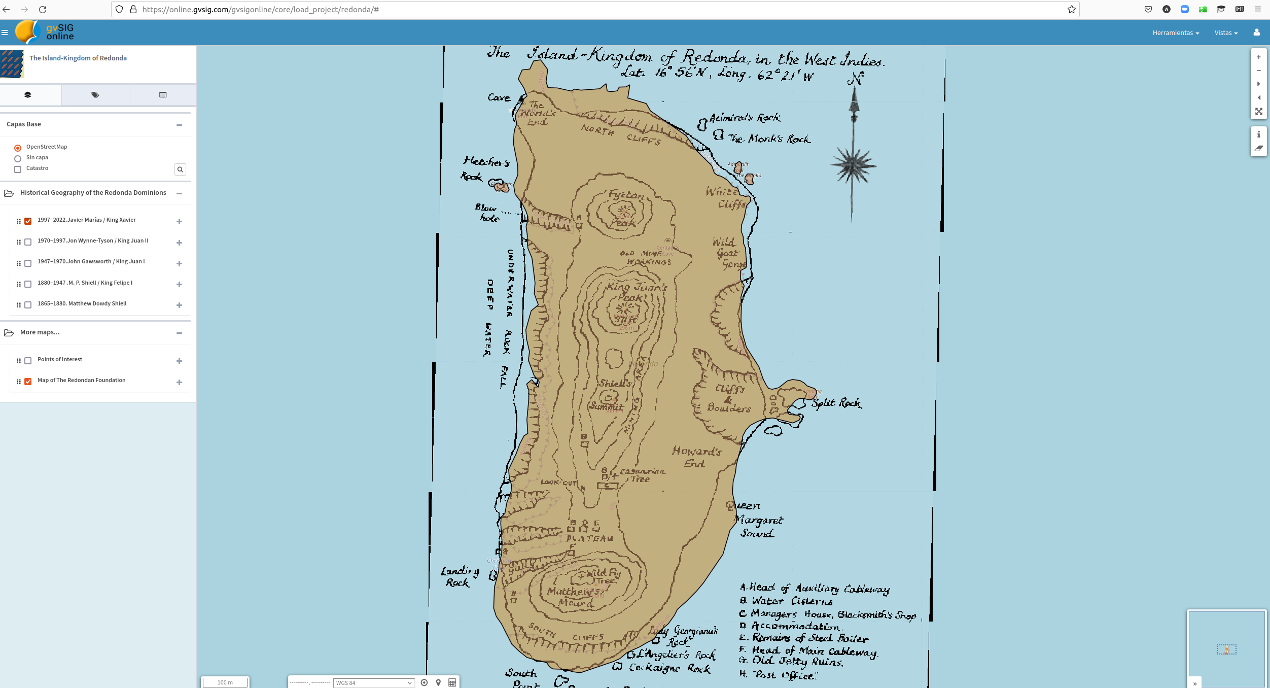 - Usando la herramienta de georreferenciación y posteriormente la de asignar proyección de gvSIG Desktop, ubiqué uno de los pocos mapas manuscritos que hay del Reino de Redonda, disponible en la web de The Redondan Foundation. Al ser un mapa dibujado no es sencillo hacerlo coincidir con sus coordenadas reales, pero creo que ha quedado medianamente bien.