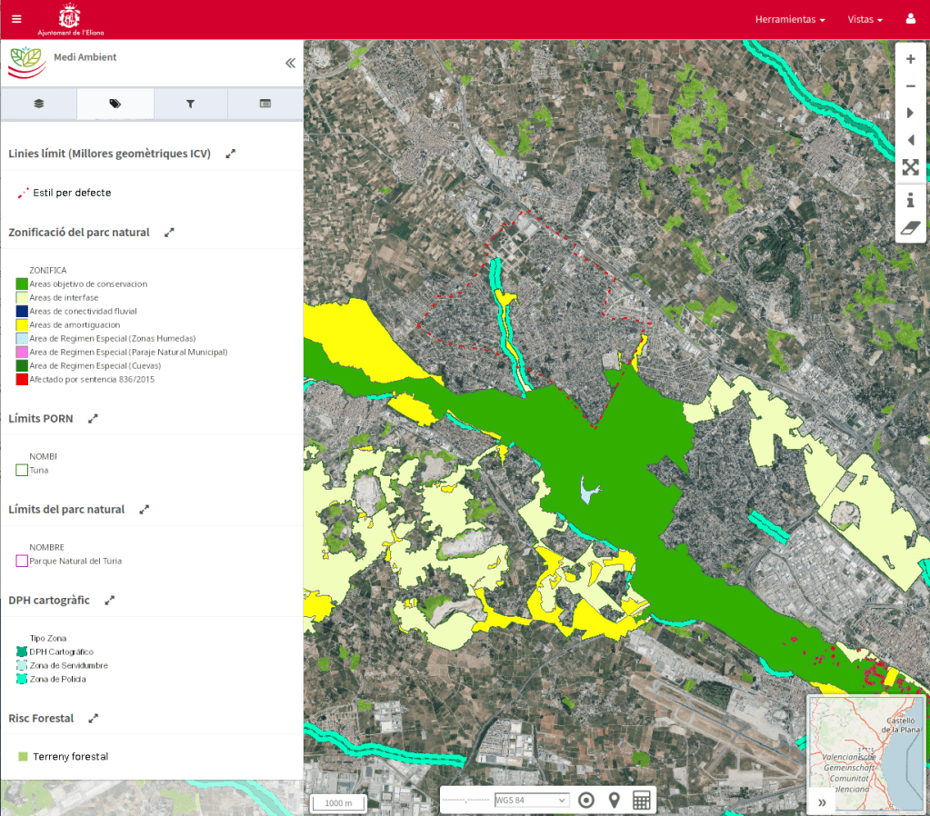 - Medio Ambiente. Permite la consulta del “Plan de ordenación de los recursos naturales (PORN)” del Parque Natural del Túria y de la cartografía de riesgos, tanto de inundaciones como forestal.