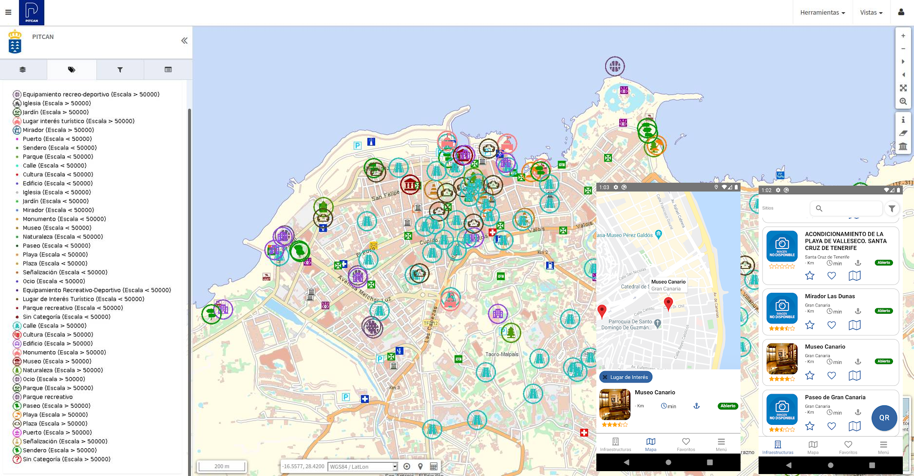 Para dar solución a estas necesidades se ha implementado gvSIG Online, como plataforma para gestionar todas la información georreferenciada relativa al PITCAN y que, por ejemplo, incluye funcionalidades para generar informes automáticos en distintos formatos. Por otro lado, se ha desarrollado una app integrada con gvSIG Online y basada en gvSIG Mapps con herramientas orientadas a facilitar las consultas a los ciudadanos y visitantes interesados en el Plan de Infraestructuras Turísticas de Canarias.