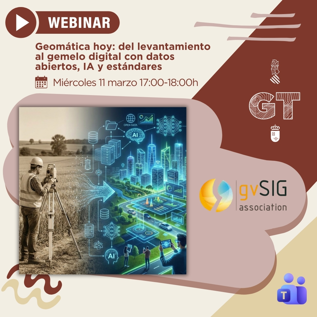 Hoy tengo el placer de impartir el webinar “Geomática hoy: del levantamiento al gemelo digital con datos abiertos, IA y estándares”, organizado por la Delegación Territorial de la Comunidad Valenciana y Región de Murcia del Ilustre Colegio Oficial de Ingeniería Geomática y Topográfica (COIGT).
